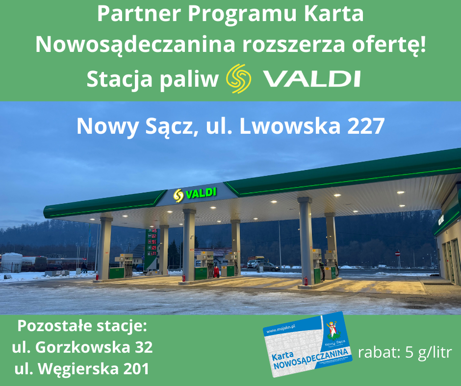 Z Kartą Nowosądeczanina zatankujesz z rabatem 5 groszy/litr paliwa już na trzech stacjach paliw VALDI w Nowym Sączu: