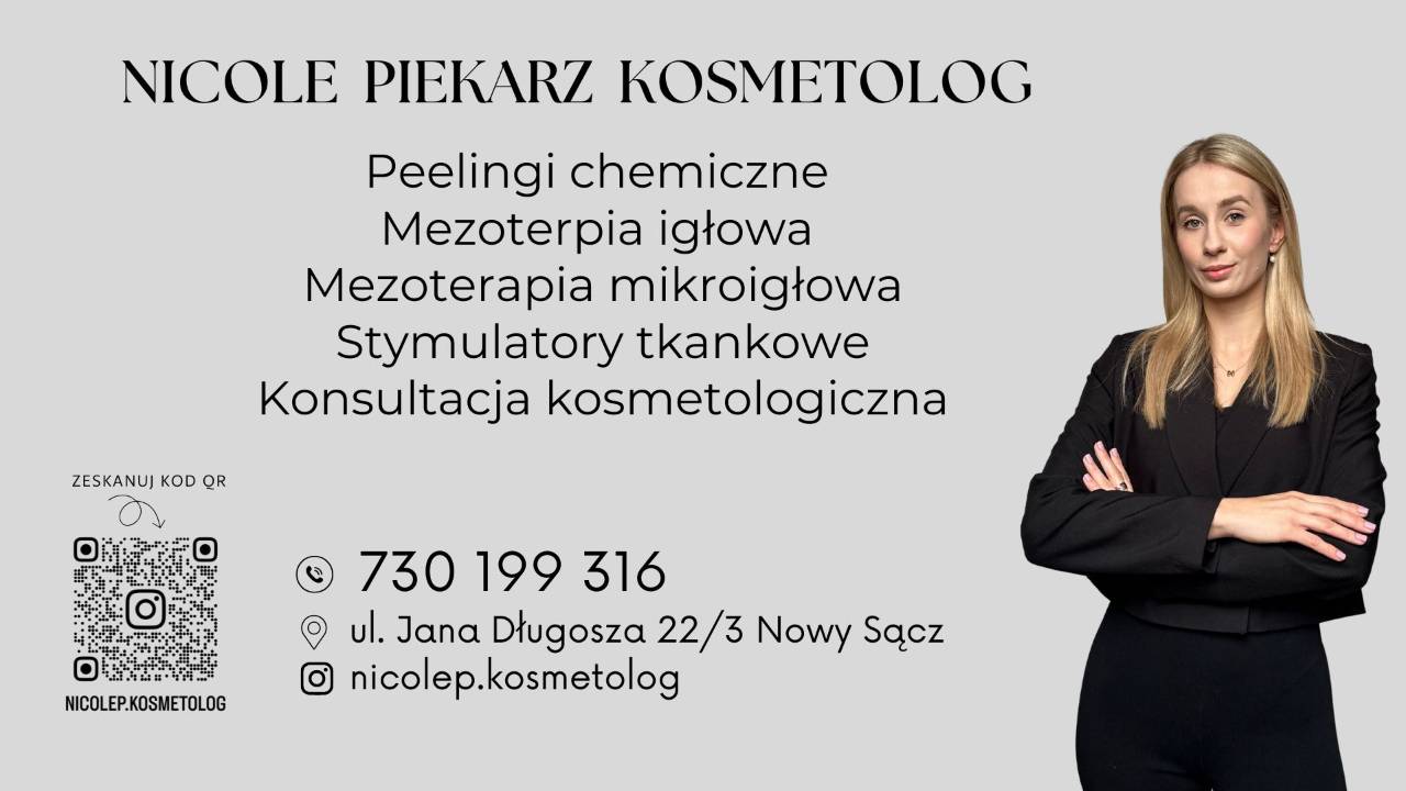 Nicole Piekarz – magister kosmetologii, prowadzi w Nowym Sączu gabinet kosmetologiczny, w którym oferuje kompleksową pielęgnację skóry twarzy i ciała. Pracuje z różnymi problemami skórnymi, takimi jak trądzik, rumień, zaskórniki, skóra podrażniona i atopowa, przebarwienia, łuszczyca, blizny, rozstępy oraz utrata jędrności.